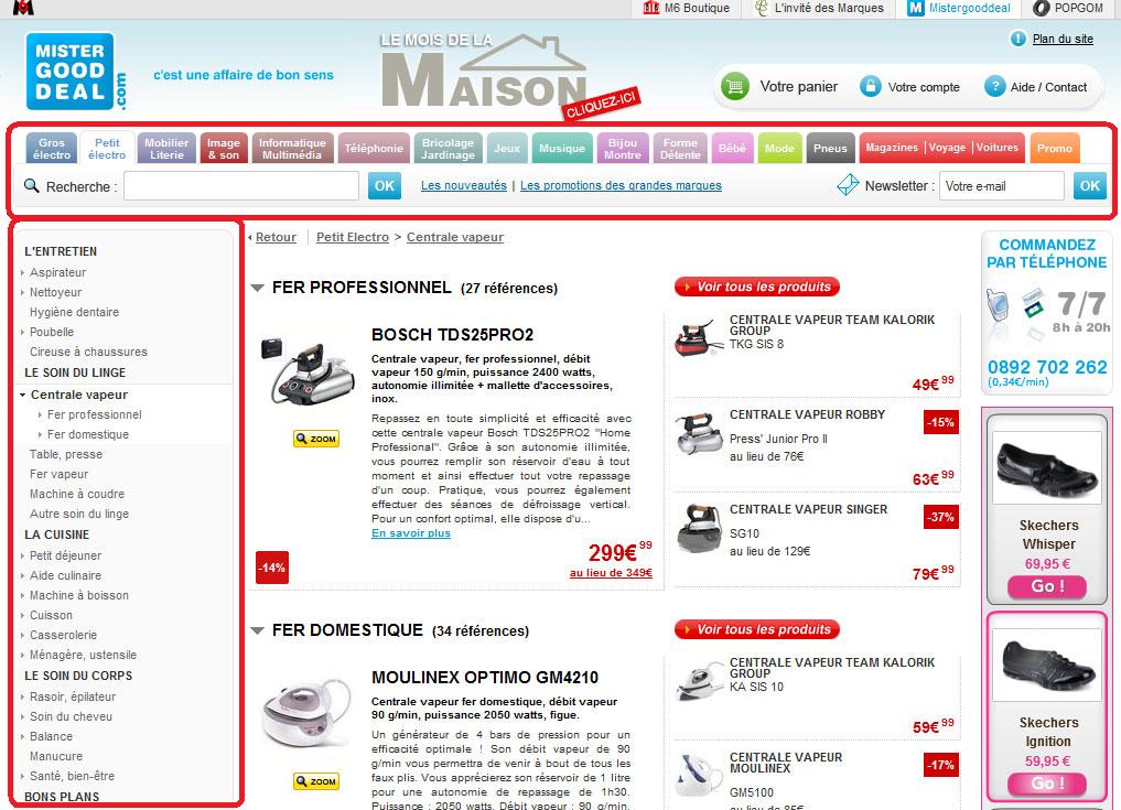 Voilà le genre de question que je me pose quand je regarde la 2ème page liste ci-dessous repérée sur le site Mistergooddeal : les filtres sont positionnés à droite, ce qui met à mal la règle traditionnelle du « T » pour naviguer efficacement en e-commerce (les catégories principales en horizontal en onglets et les catégories plus fines à gauche en vertical).