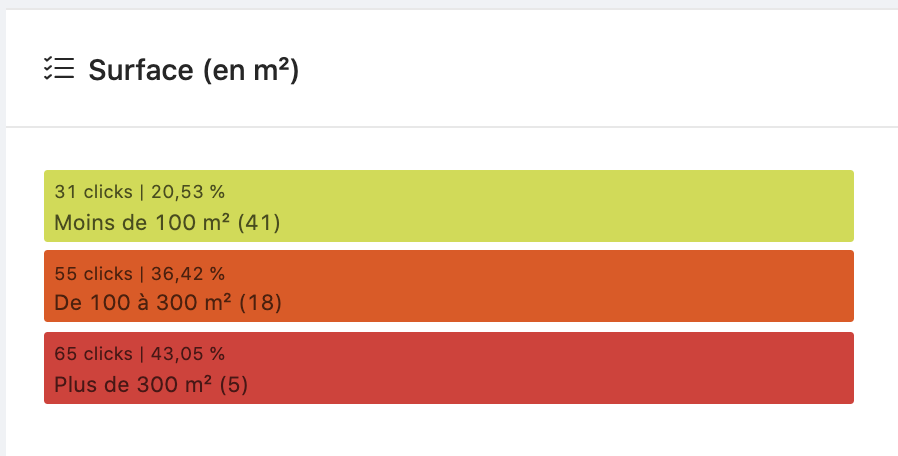 Il faudrait ici afficher uniquement 3 valeurs : de 0 à 100m2 / de 100 à 300 m2 / Plus de 300 m2 pour répartir les produits de façon homogène et logique. Etrangement, c’est très bien fait dans cette autre catégorie accessible via un niveau d’arborescence plus profond :